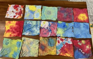 今日はしぼり染めに挑戦しました!見たことある模様だけど、どんなんにするん??と不思議そうな子ども達😕説明書を見ながら色々考えていました。 まずはキッチンタオルを何ヶ所か輪ゴムで止めます。 そして好きな色を選び、好きな場所…
