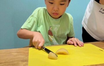 今日のおやつはフルーツポンチ♪みんなで作っていきます!まず、桃を一口サイズに切ります。 切った桃に他のフルーツを入れ、カラフルなゼリーも投入😄 これで完成✨と思っていたら…炭酸ジュースとメントスが登場。果物が入ったボウル…