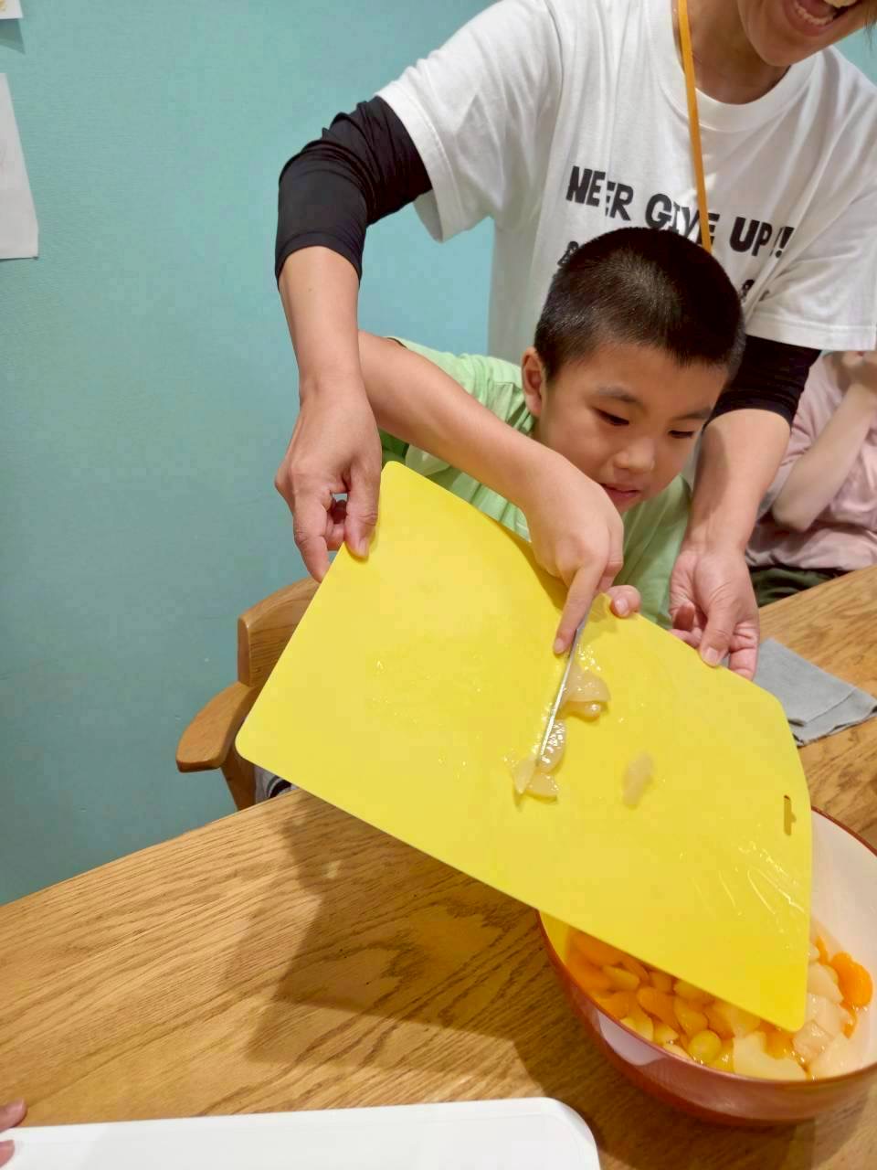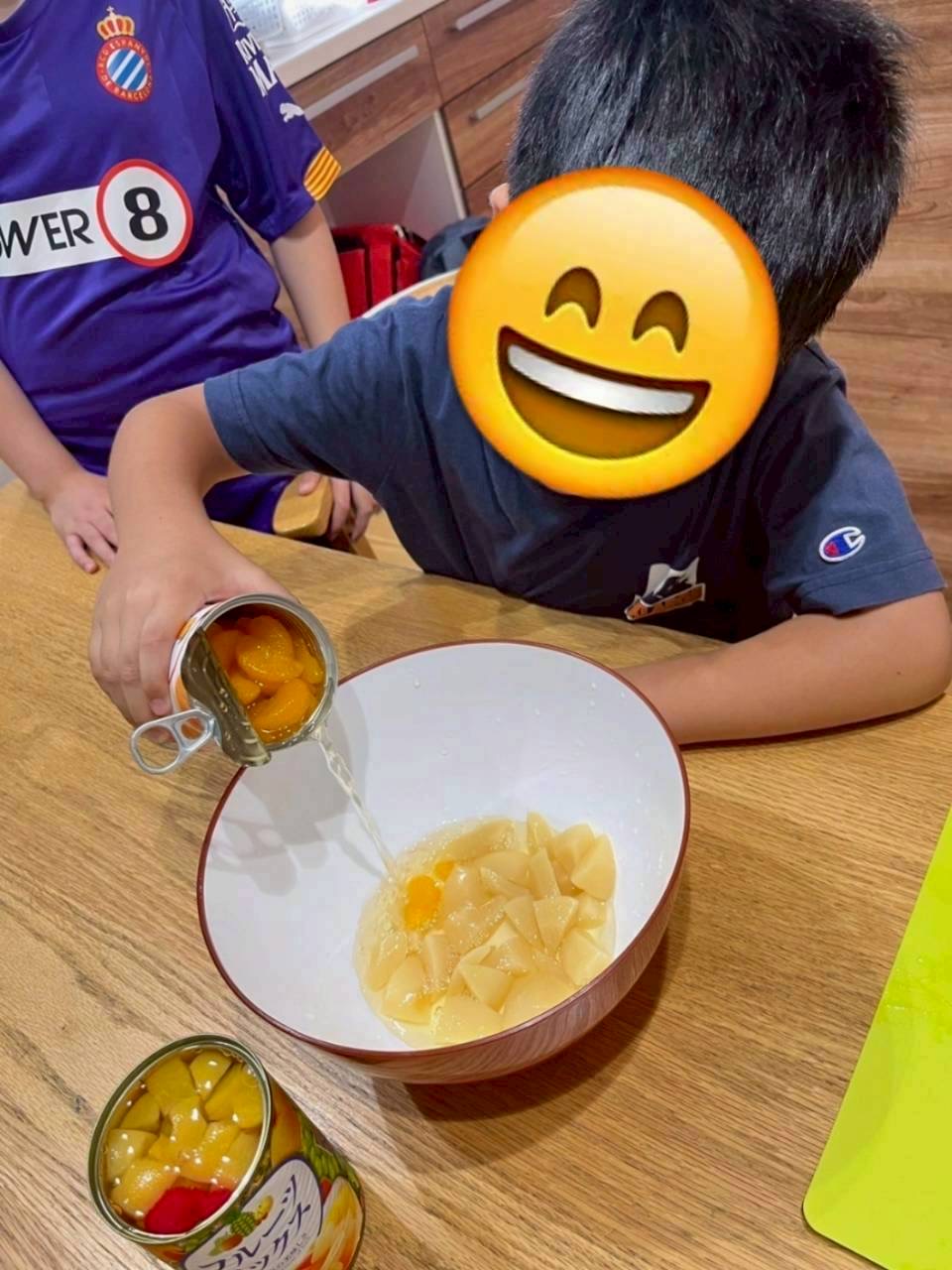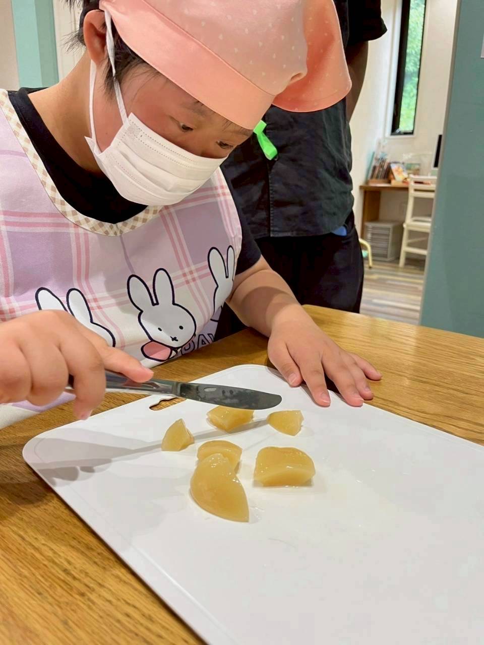 今日のおやつはフルーツポンチ♪みんなで作っていきます!