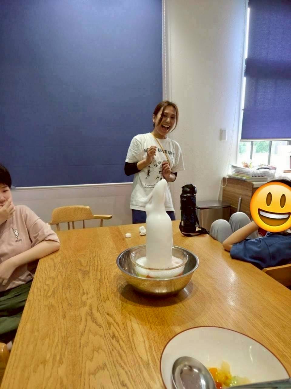 果物が入ったボウルに炭酸ジュースをセットして、メントスを入れると、「!!!」炭酸が噴水みたいに噴き出して職員も子ども達もみんなビックリ!