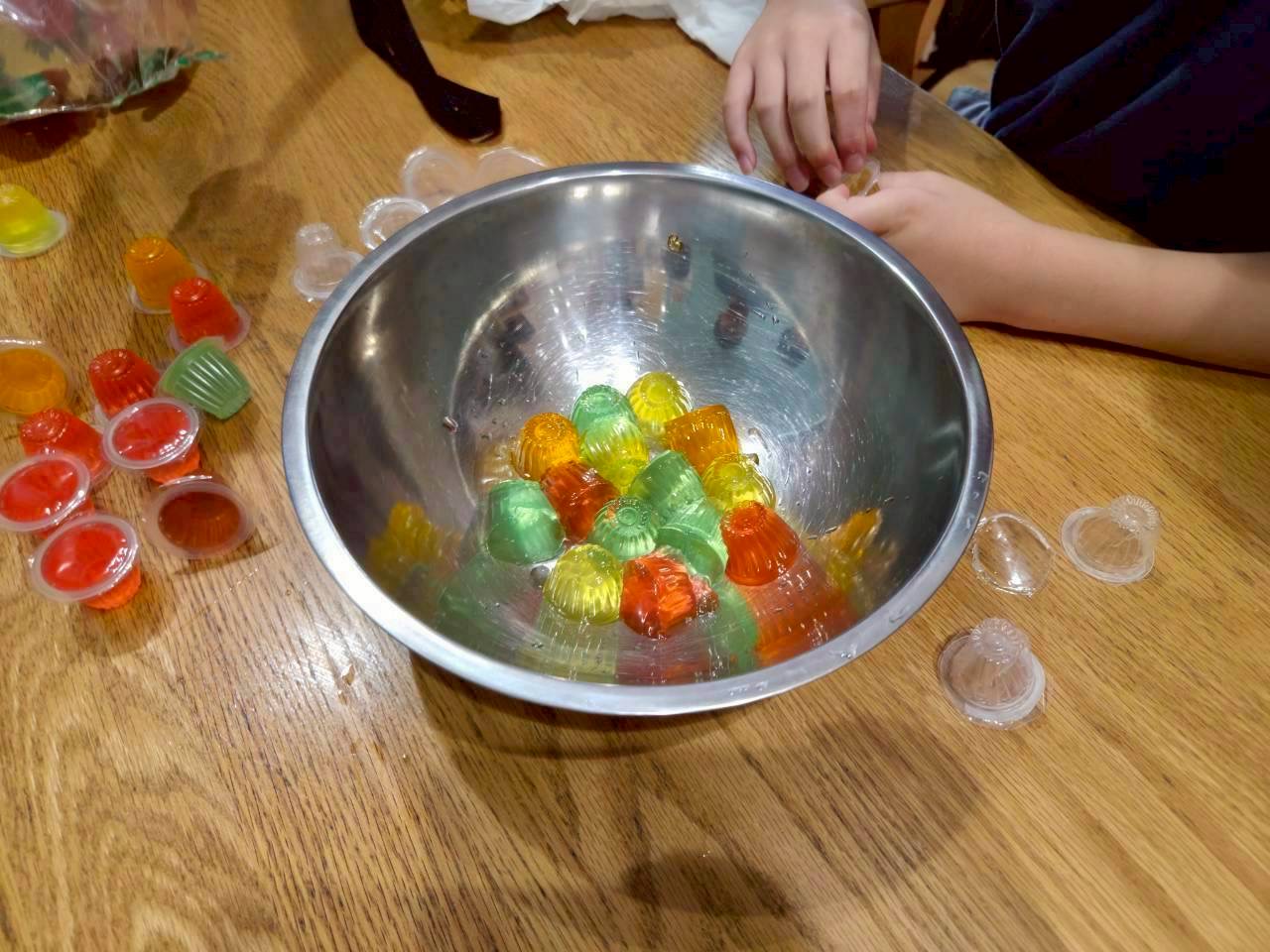 切った桃に他のフルーツを入れ、カラフルなゼリーも投入😄