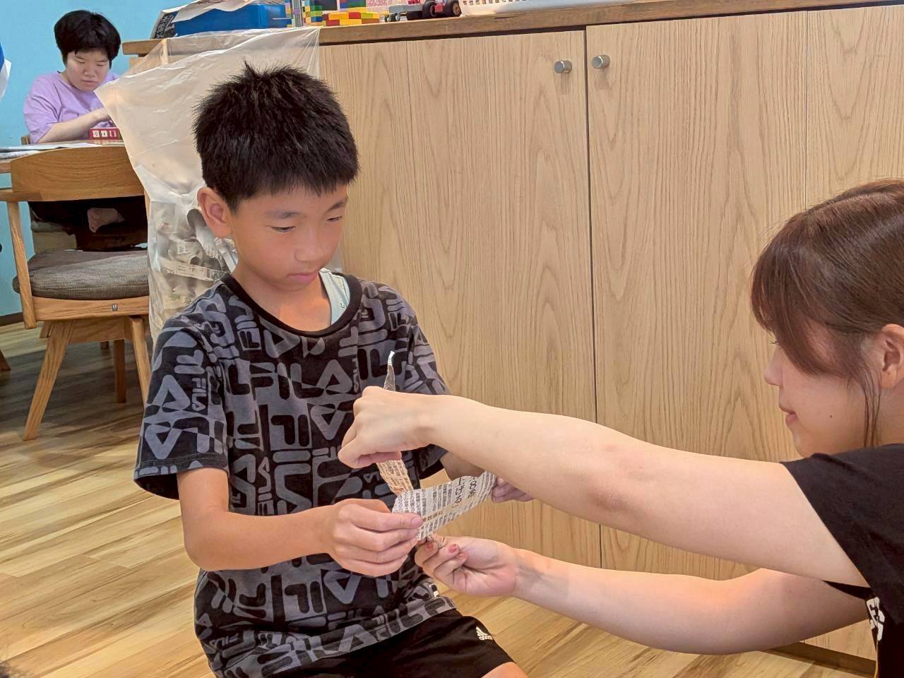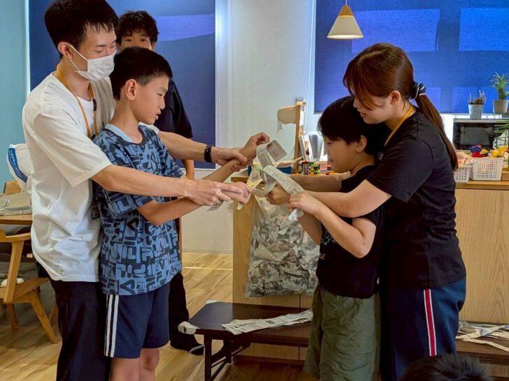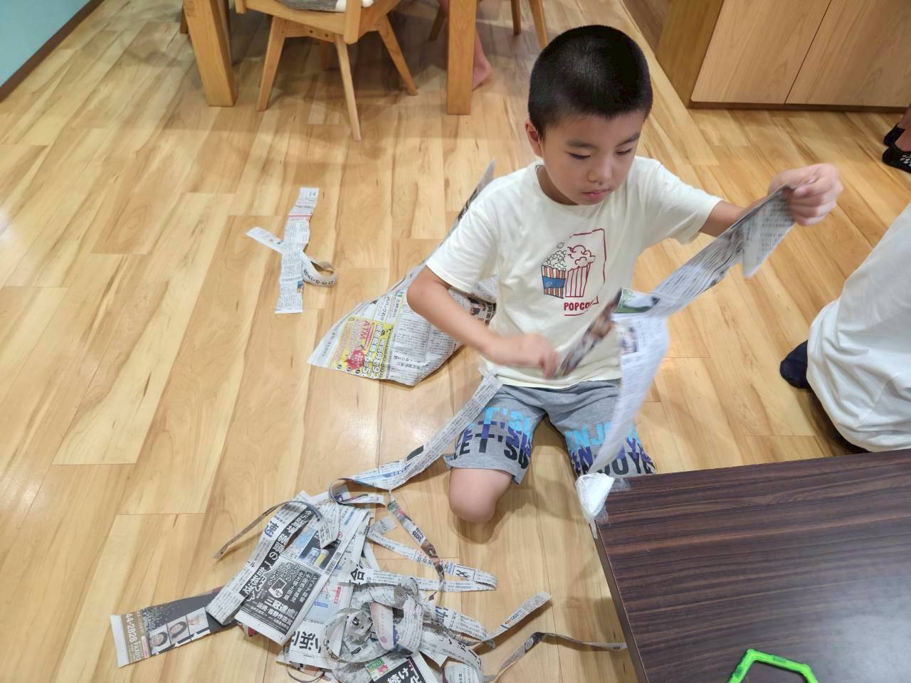 みんなルールをしっかり聞いて、新聞紙を細長くちぎります。みんな真剣に戦う新聞紙をちぎっていきます。