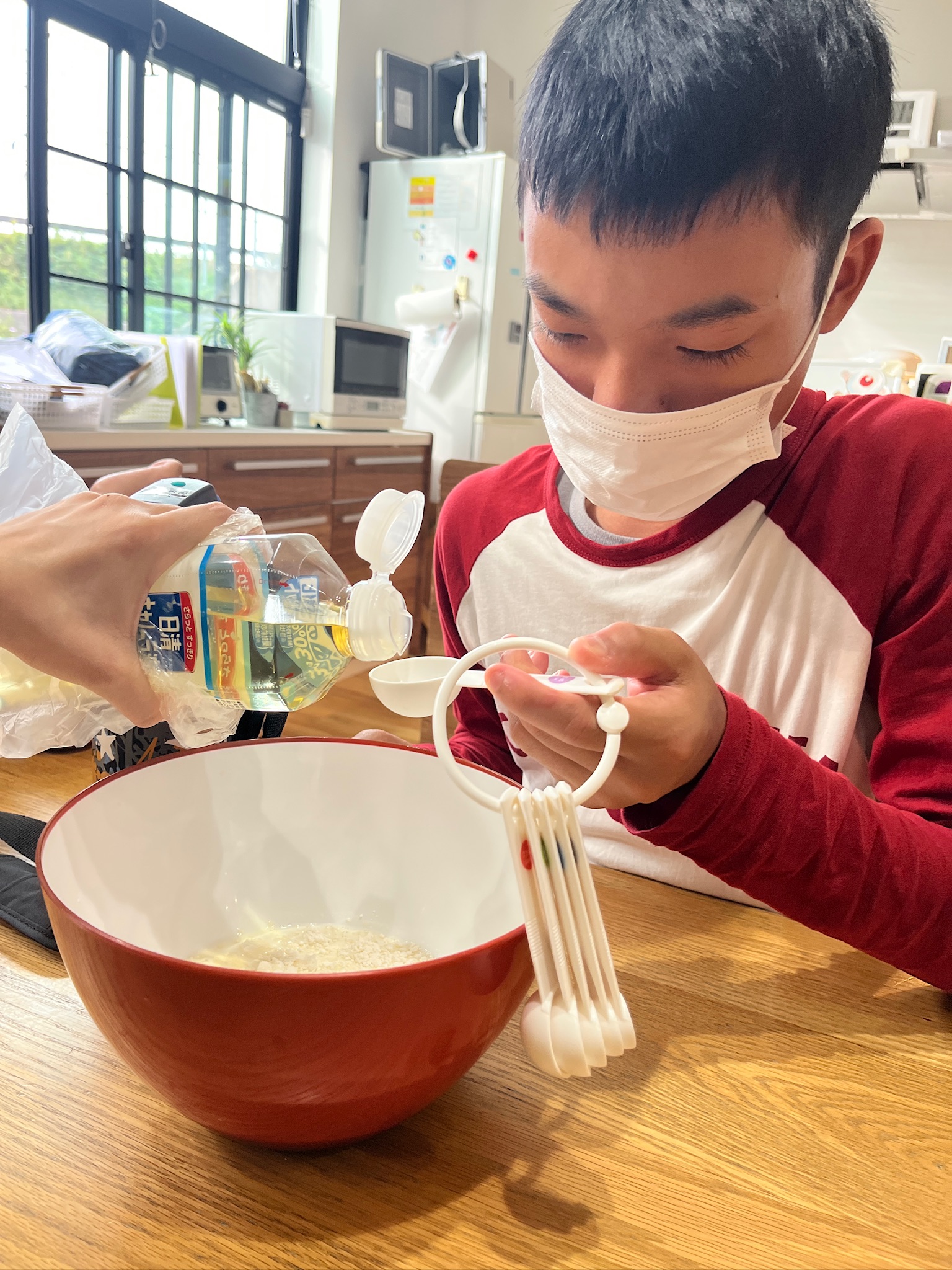 まずはボールに、ホットケーキミックスと牛乳と油を計っていれます。お姉さん、お兄さんたちは手慣れた様子です👏