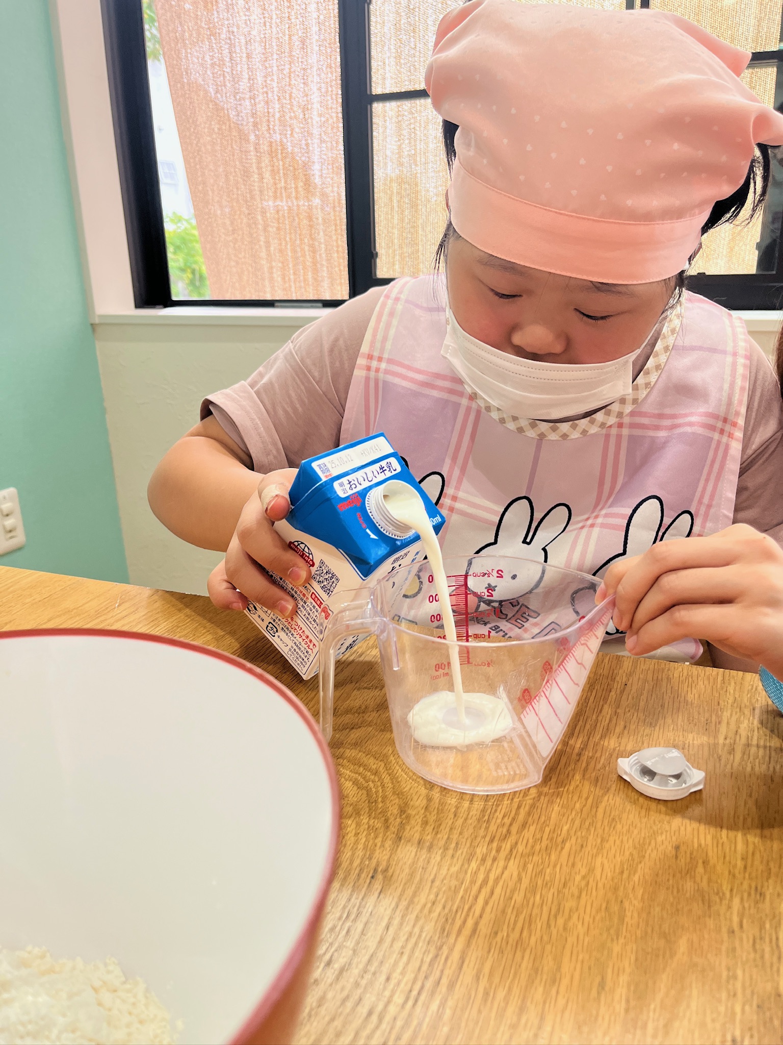 まずはボールに、ホットケーキミックスと牛乳と油を計っていれます。お姉さん、お兄さんたちは手慣れた様子です👏