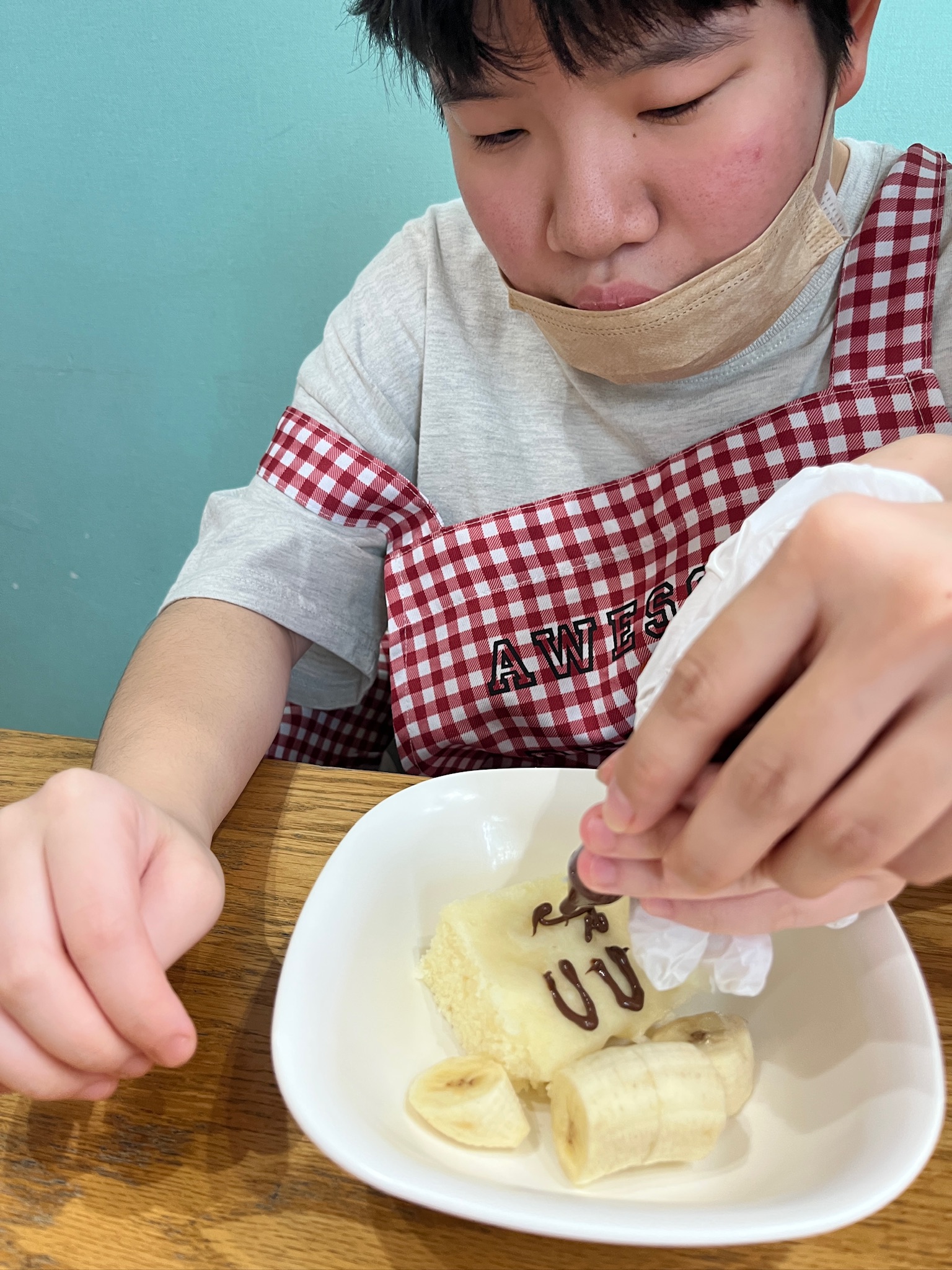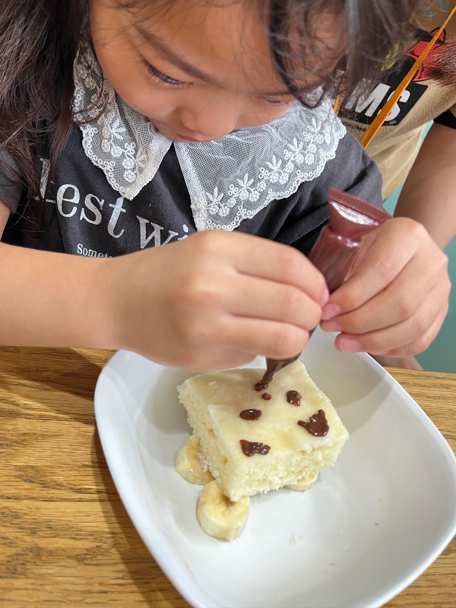 出来上がった蒸しパンに、うさぎの耳とお顔をチョコペンでかきます!そして、バナナとチョコスプレー、生クリームでちょっぴり豪華に仕上げてみました!