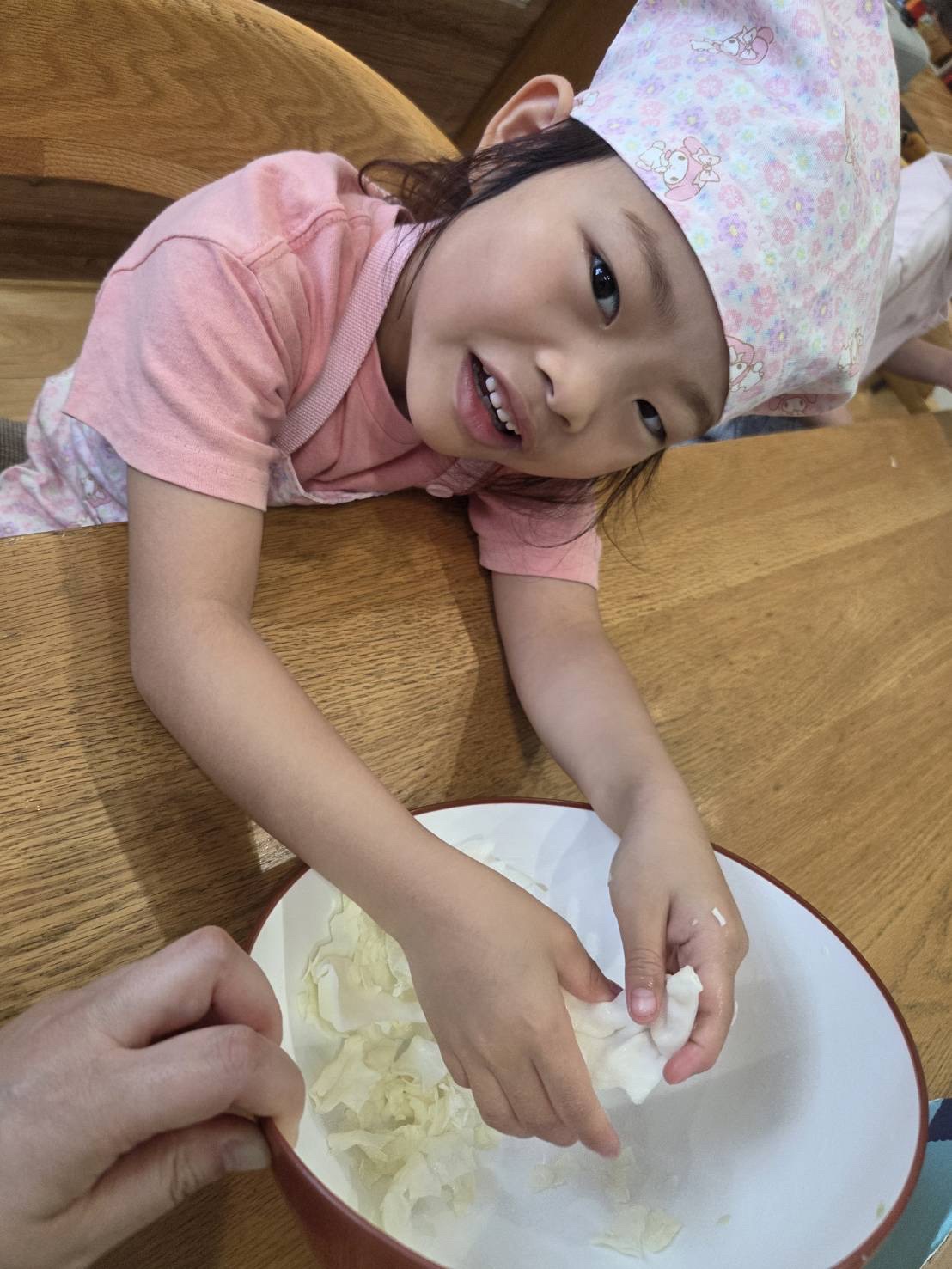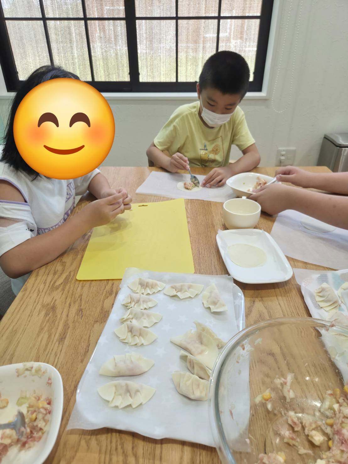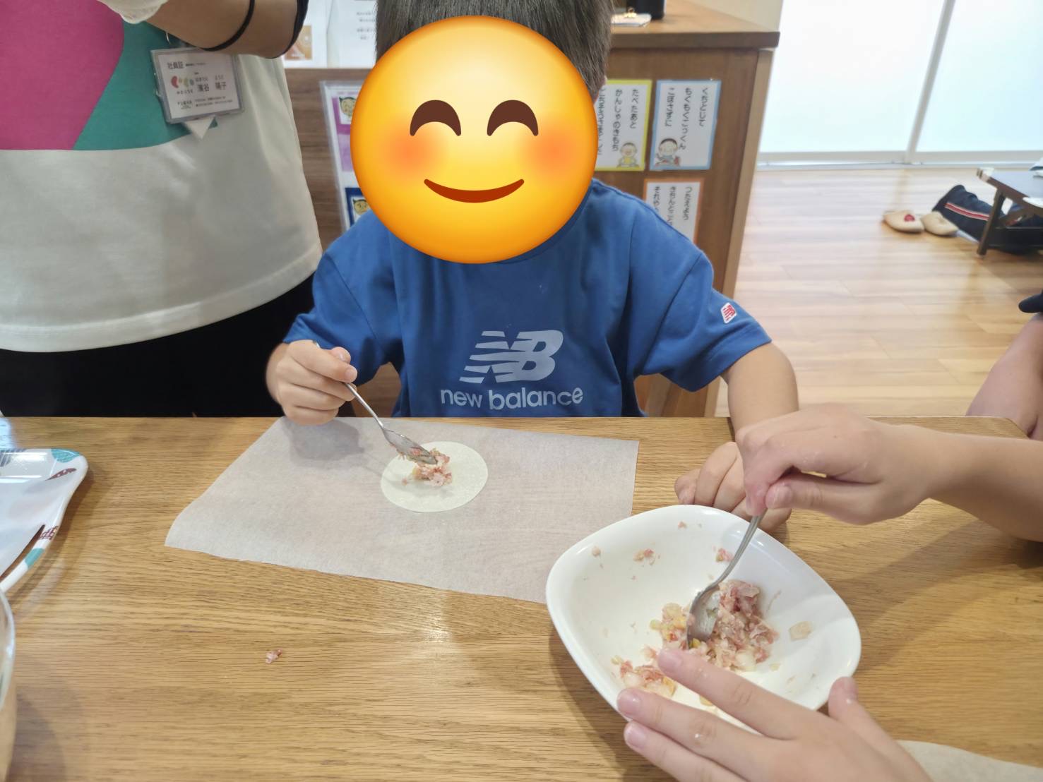 今回は、お昼ご飯に餃子を作りました☺️「今日は餃子だ!」と楽しみにしている子ども達。具材を細かく切って、お肉をこねて…一番、大変だったと言っていたのが、お肉を包む作業でした😁中身が多くなると包めず苦戦💦「このくらいね」とお手本を見ながら挑戦していました。