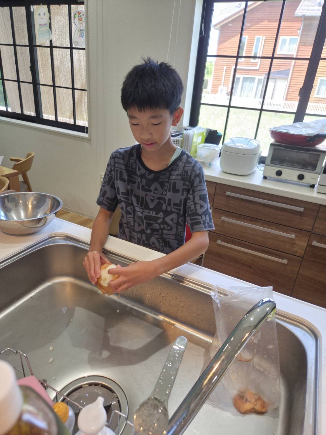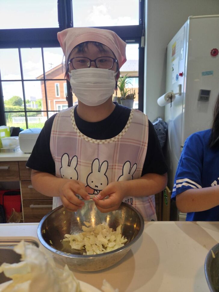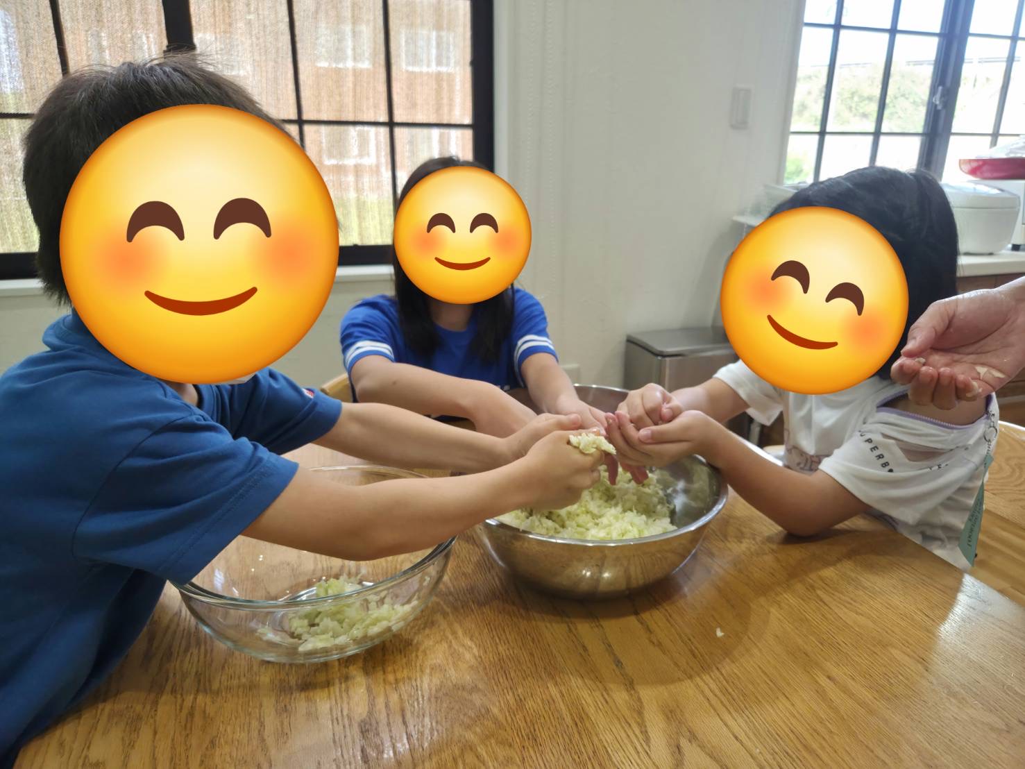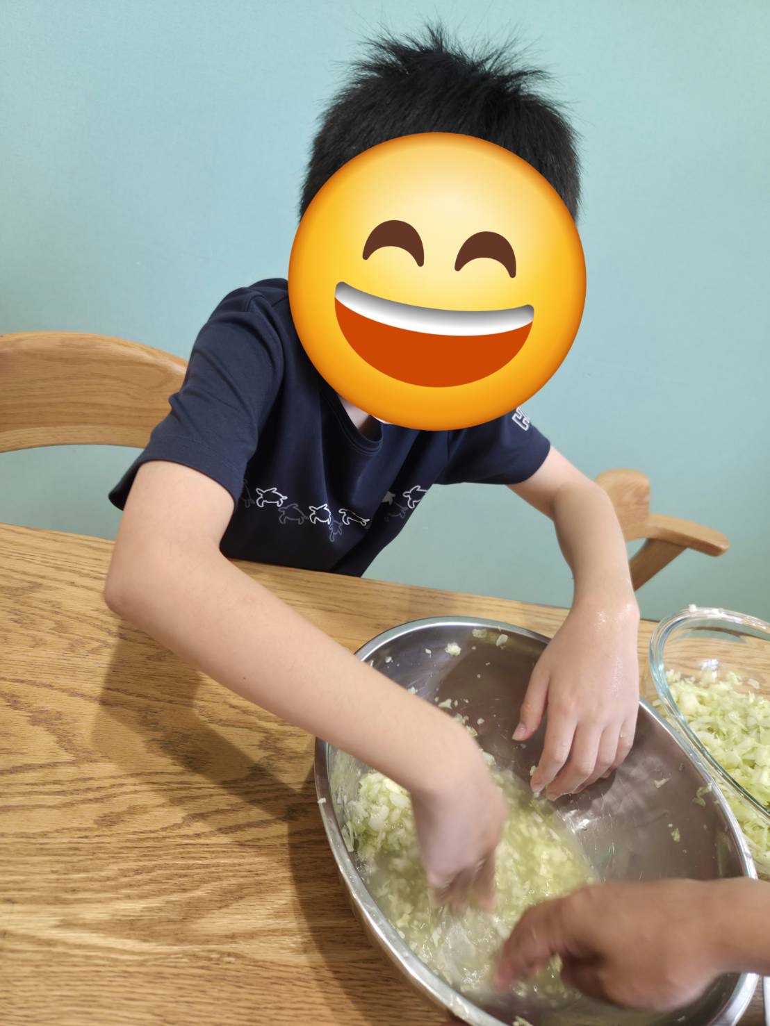 今回は、お昼ご飯に餃子を作りました☺️「今日は餃子だ!」と楽しみにしている子ども達。具材を細かく切って、お肉をこねて…一番、大変だったと言っていたのが、お肉を包む作業でした😁中身が多くなると包めず苦戦💦「このくらいね」とお手本を見ながら挑戦していました。