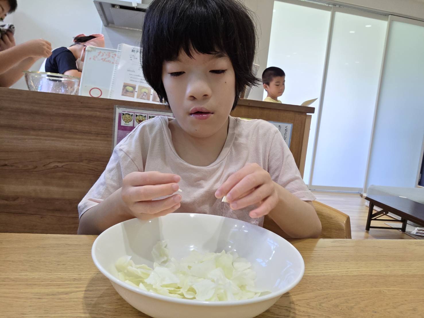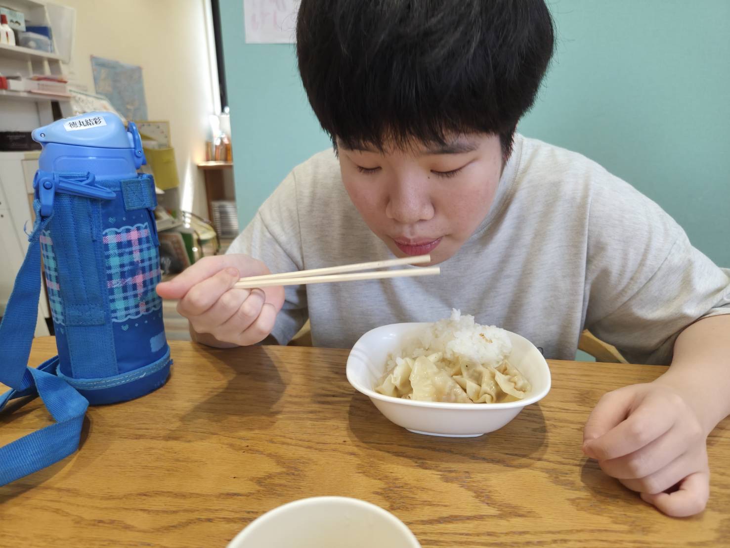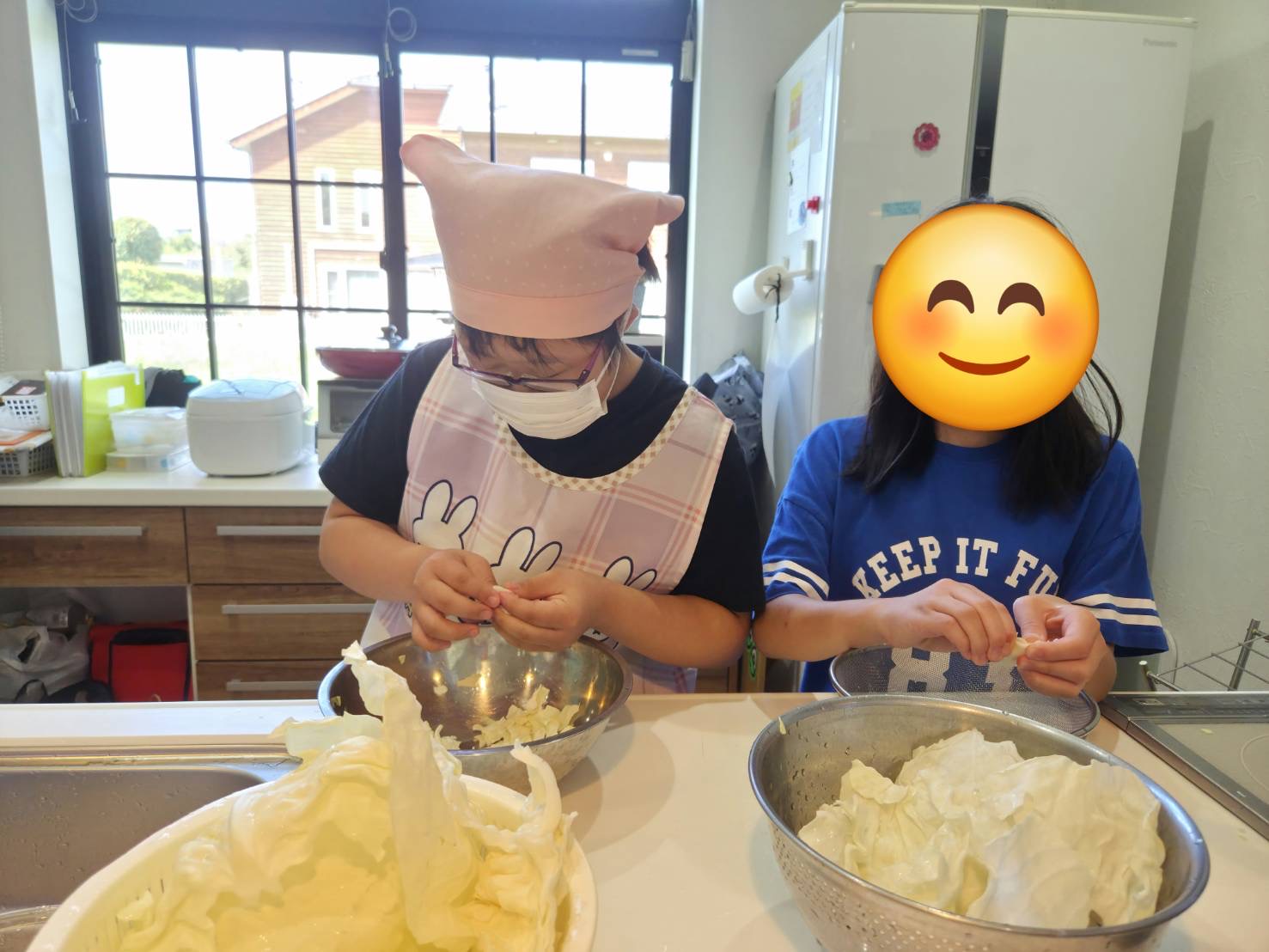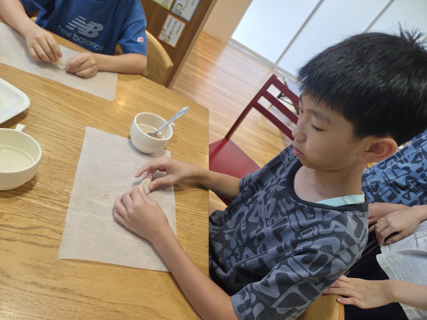 今回は、お昼ご飯に餃子を作りました☺️「今日は餃子だ!」と楽しみにしている子ども達。具材を細かく切って、お肉をこねて…一番、大変だったと言っていたのが、お肉を包む作業でした😁中身が多くなると包めず苦戦💦「このくらいね」とお手本を見ながら挑戦していました。