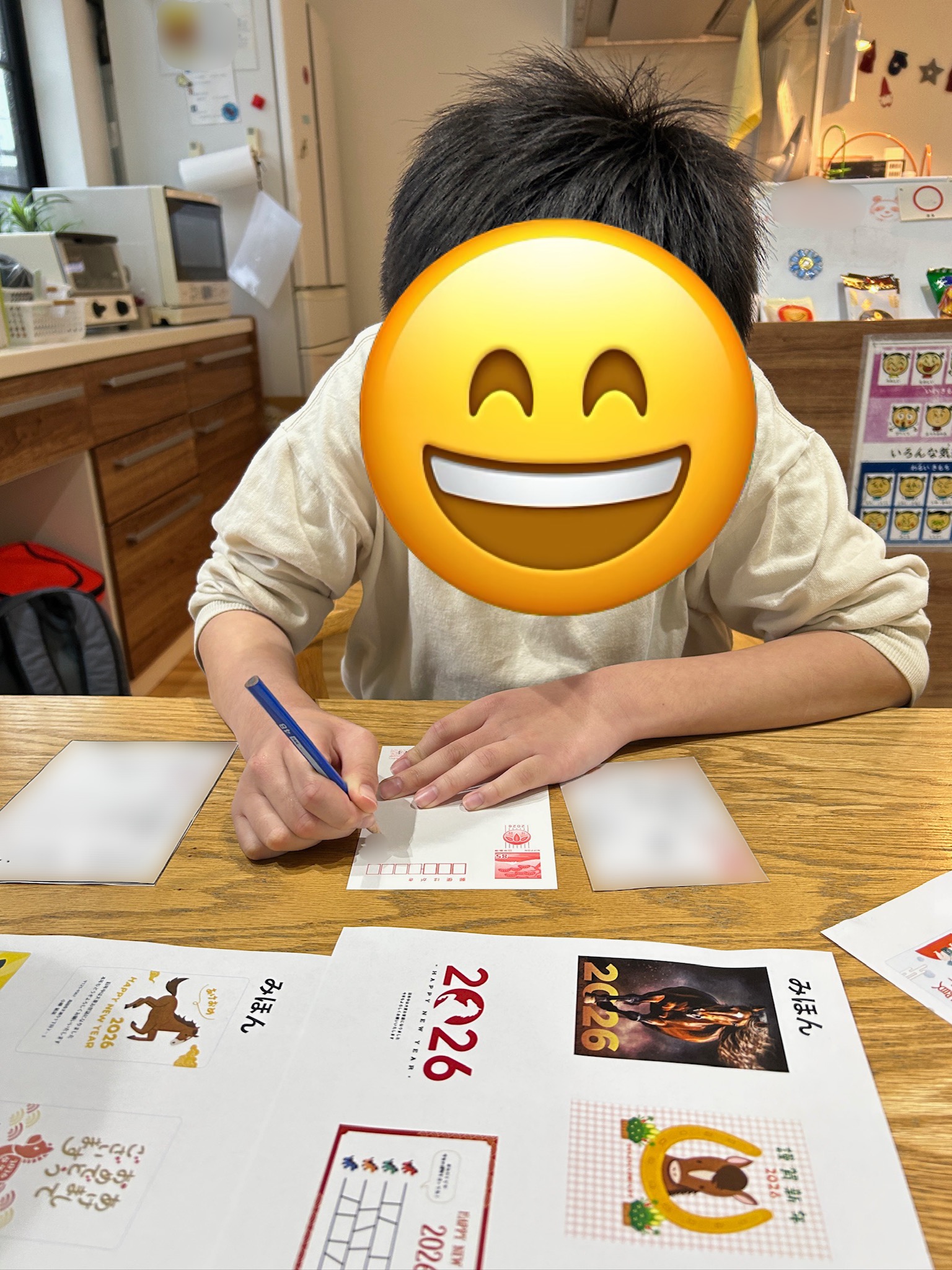 最近は年賀状を出す習慣が少なくなっていますが、今回は日本の文化に触れる機会として、年賀状作りに挑戦しました。まずは名前と住所を書いていきます。