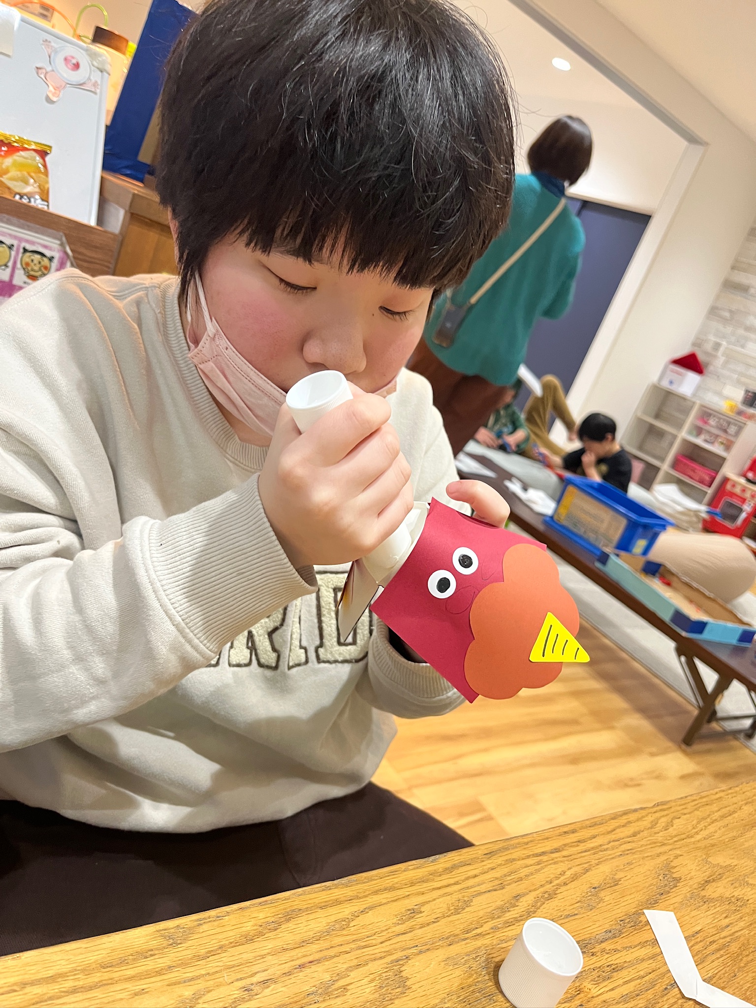 紙コップを切って、鬼のパンツに模様を書いたり、お顔を書いたり✏️説明を聞きながら集中して、あっという間に完成させていましたよ!