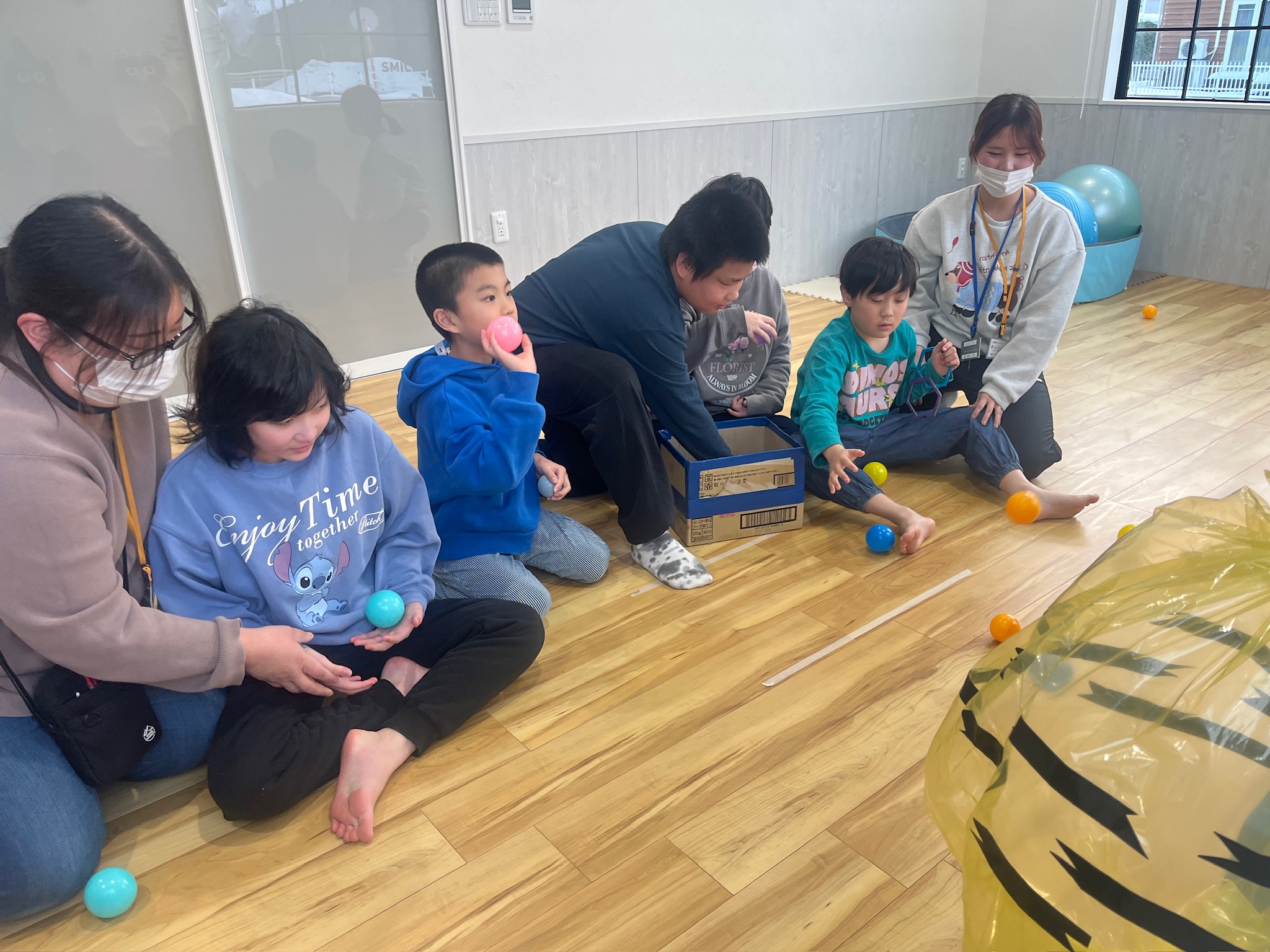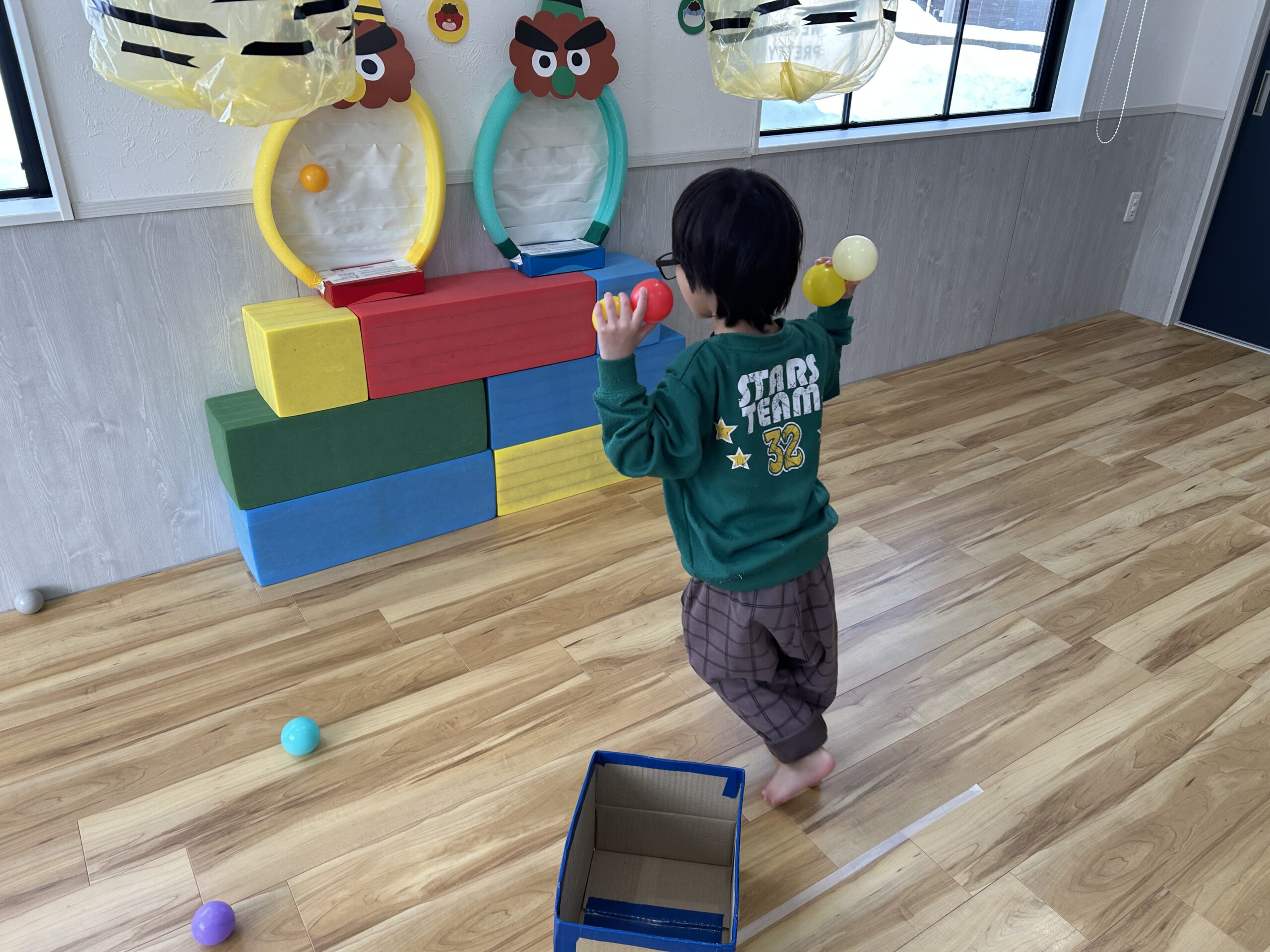 カラーボールで鬼をやっつけよう!大きな声で「鬼は外!福は内!」