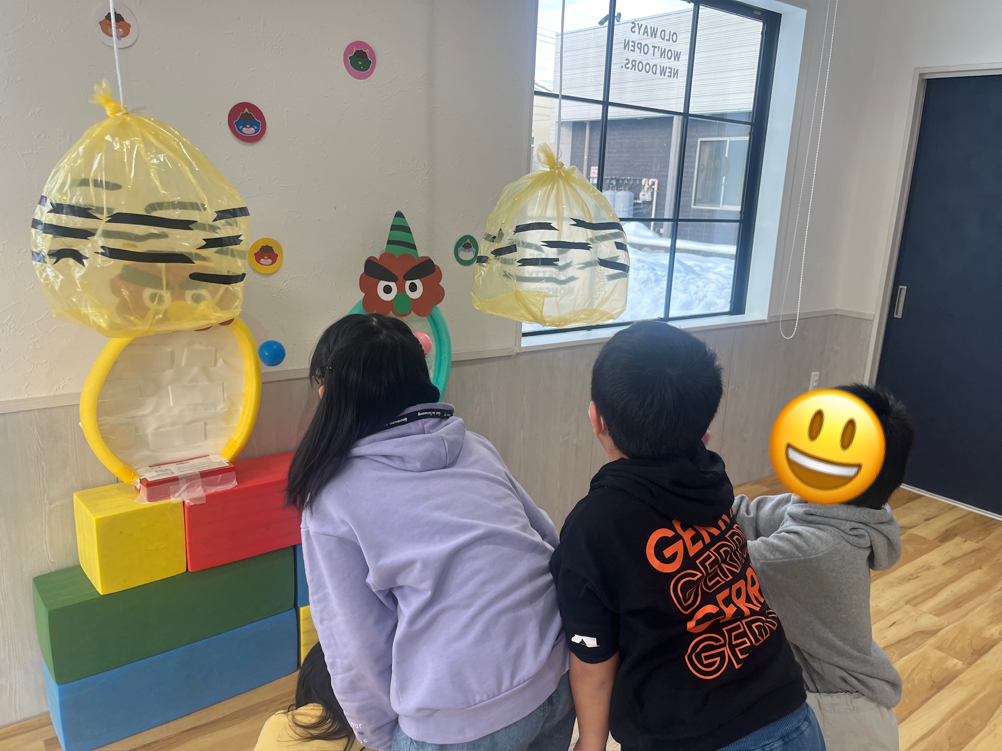鬼のお口にボールを当てるゲームもしました!「たくさん当てるぞー!」と意気込みバッチリの子どもたちでした😀