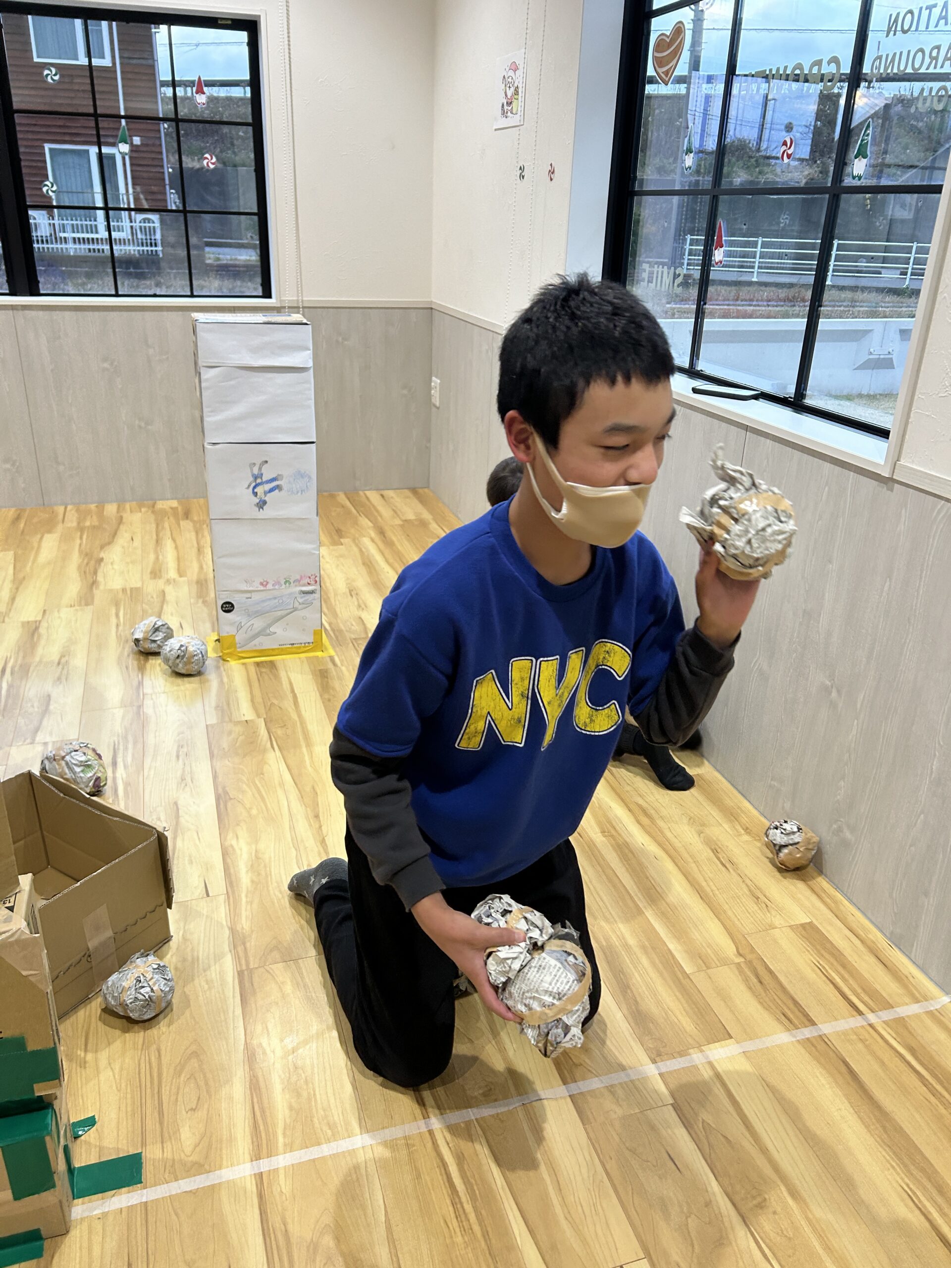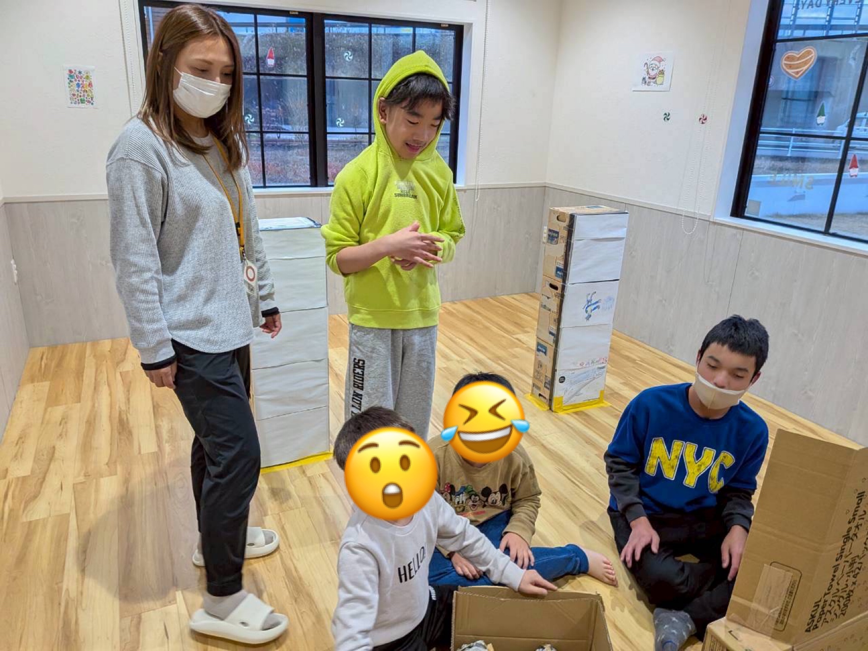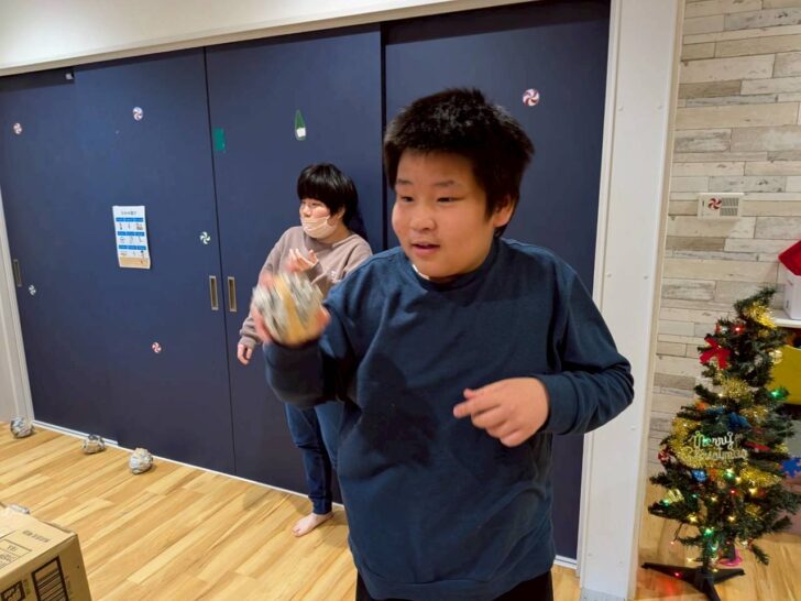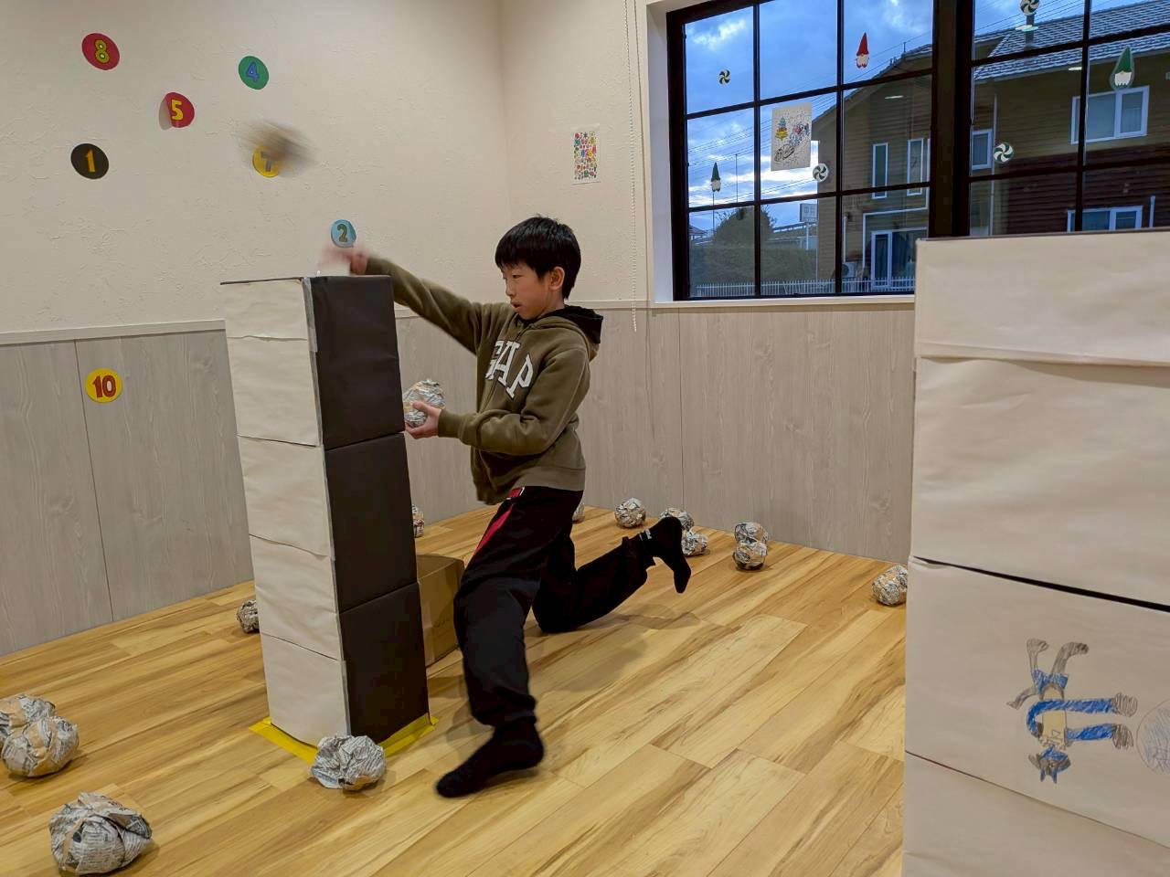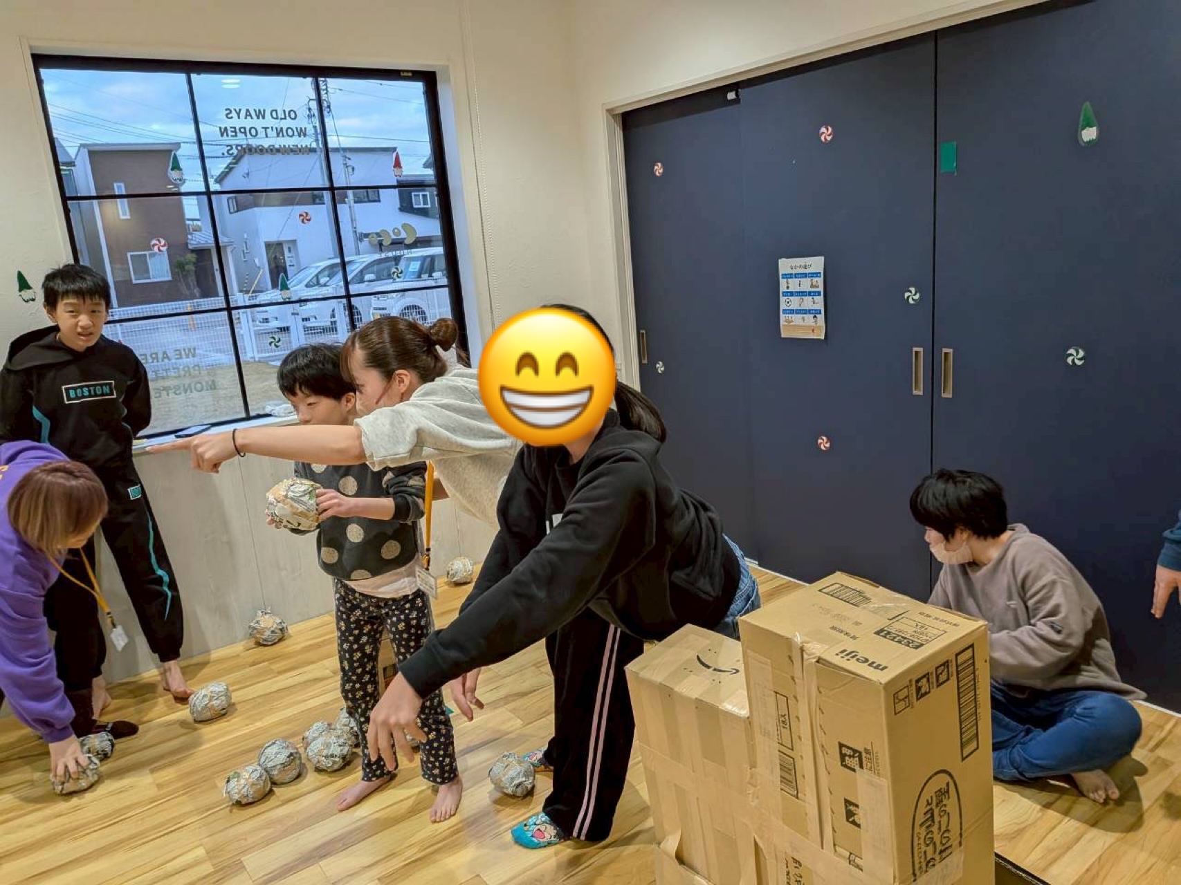 今日は新聞紙雪合戦をしました。ルールは簡単です!2つのチームに分かれて、雪玉に見立てた新聞紙を相手の陣地に投げます。時間内に多くの雪玉を投げることができたチームの勝ち🏆ルールを聞いただけでもワクワクです。それでは、さっそくスタート⭐️