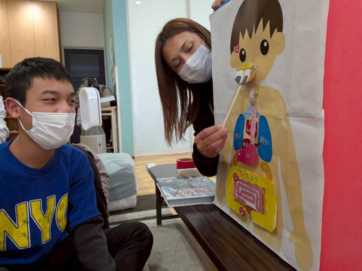 今回は、みんなで“自分の体の仕組みを知ろう!”とのことで食べ物が口から入って便になるまでを勉強しました。体の中ってこうなっているんだ!と不思議に思いながら、みんな真剣に話を聞いていました😃