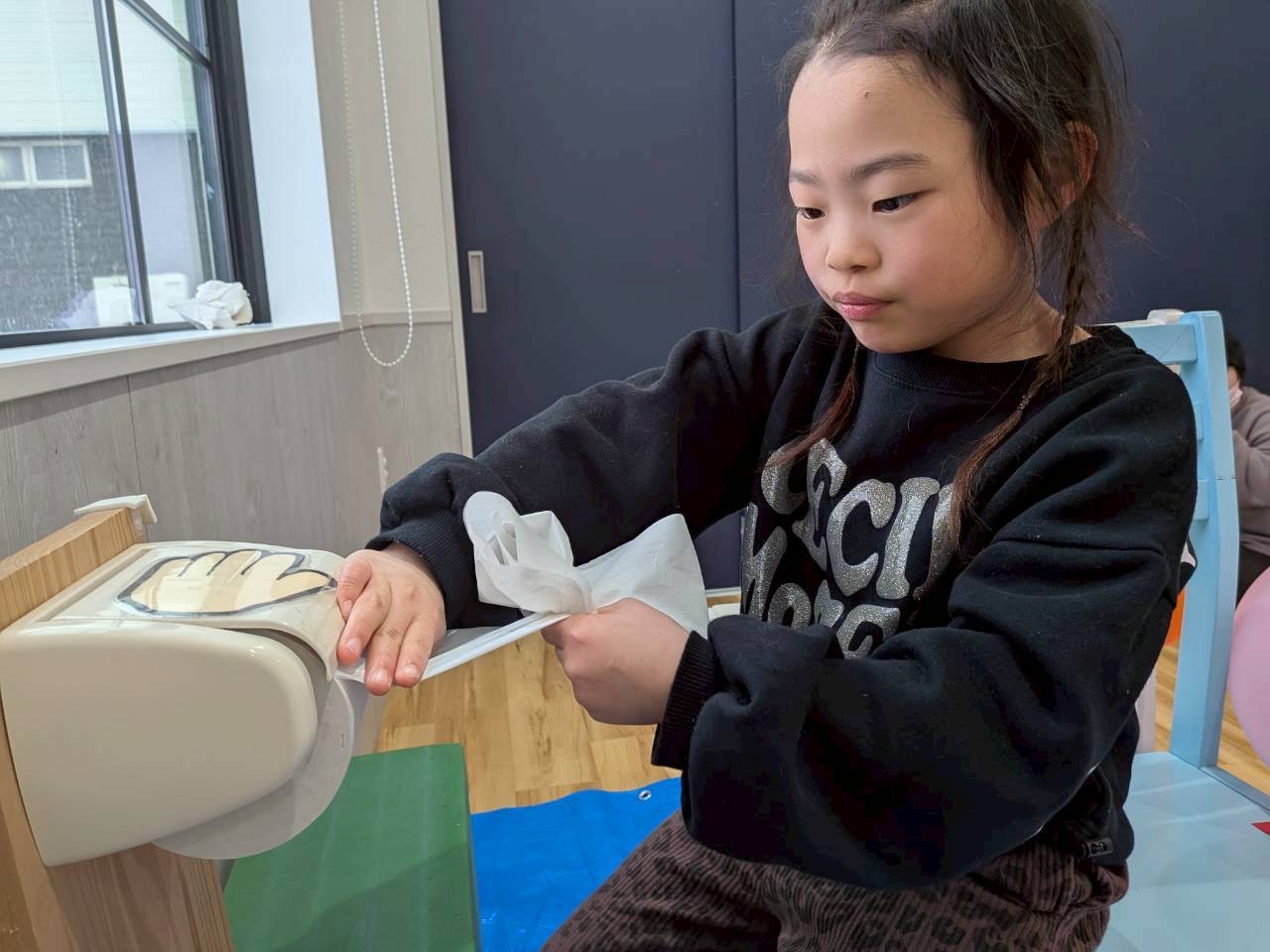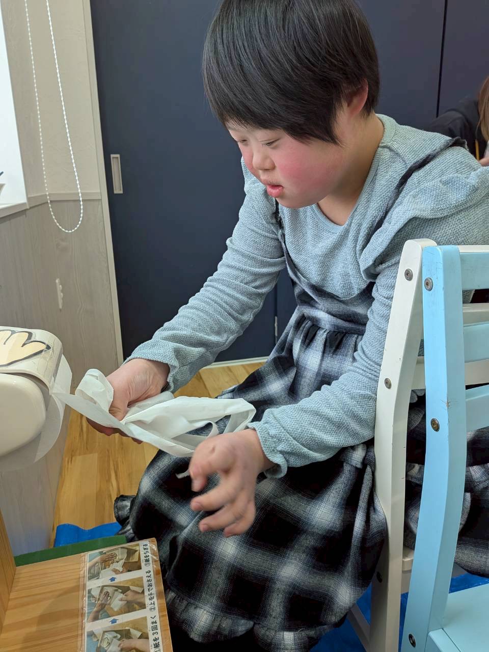 クイズが終わった後は、便が出た後にお尻をきれいにする拭き方について勉強しました❗️トイレットペーパーのちぎり方や、お尻を拭くときの力加減等を職員と一緒に確認しながら取り組んでいます❗️