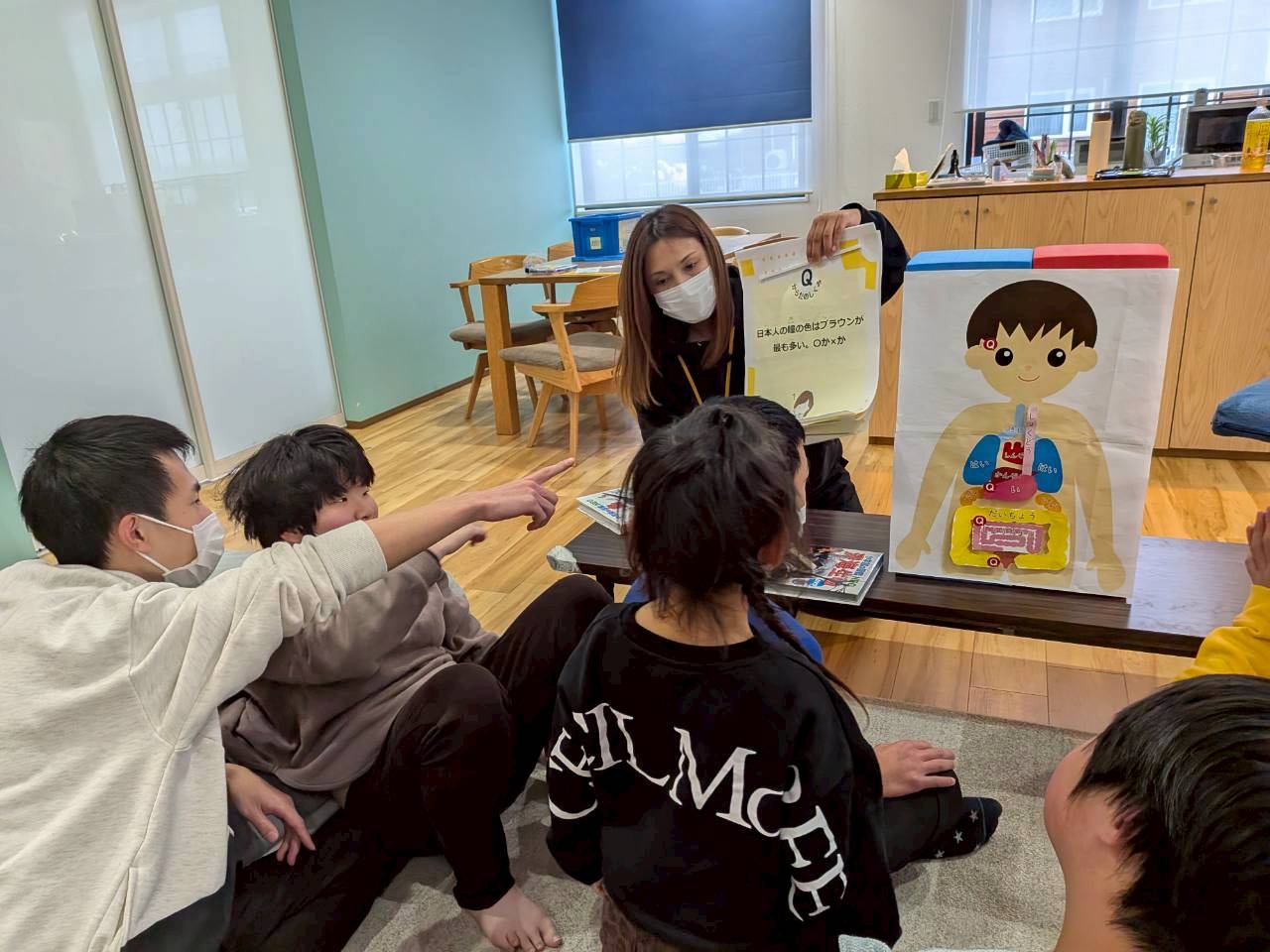 今回は、みんなで“自分の体の仕組みを知ろう!”とのことで食べ物が口から入って便になるまでを勉強しました。体の中ってこうなっているんだ!と不思議に思いながら、みんな真剣に話を聞いていました😃